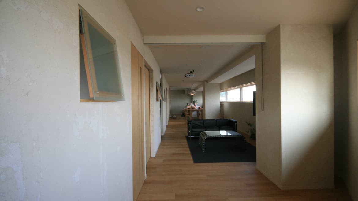 床は3層の楢のフローリング、リビングの壁は樹脂モルタル天井クロスにて施工、各部屋には小窓を設けました。この小窓はフロストガラスにビス穴を開けて枠を取付、開閉可能にしております。気密性は有りません。ただこちら窓をリビングとつなげる事でエアコン1台でまかなう事に少しでも役にたてないかとの思いで作りました。